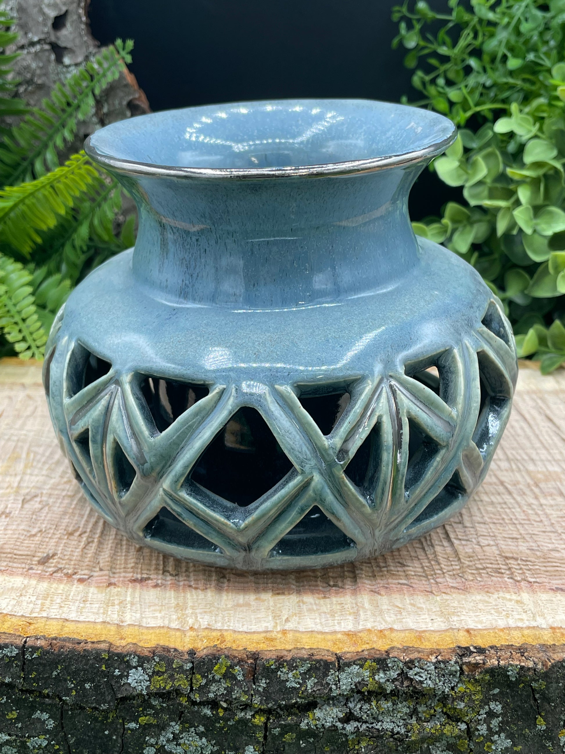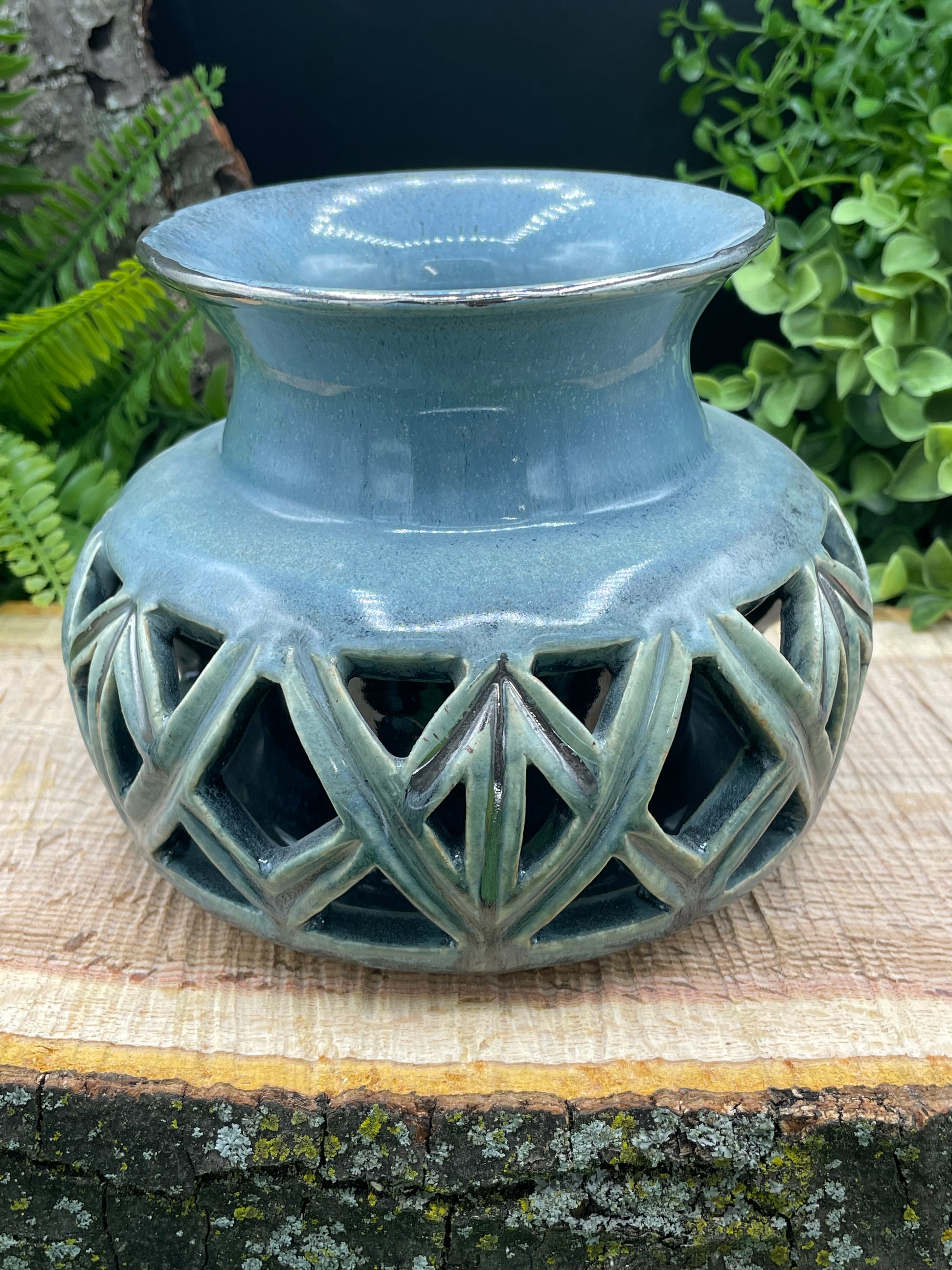 "Add a touch of whimsy and elegance to your home! This double wall vase boasts a stunning blue glaze and intricate carved designs. Perfect for showcasing your favorite flowers in a unique and eye-catching way. A must-have for any stylish home. (Flowers not included.)"