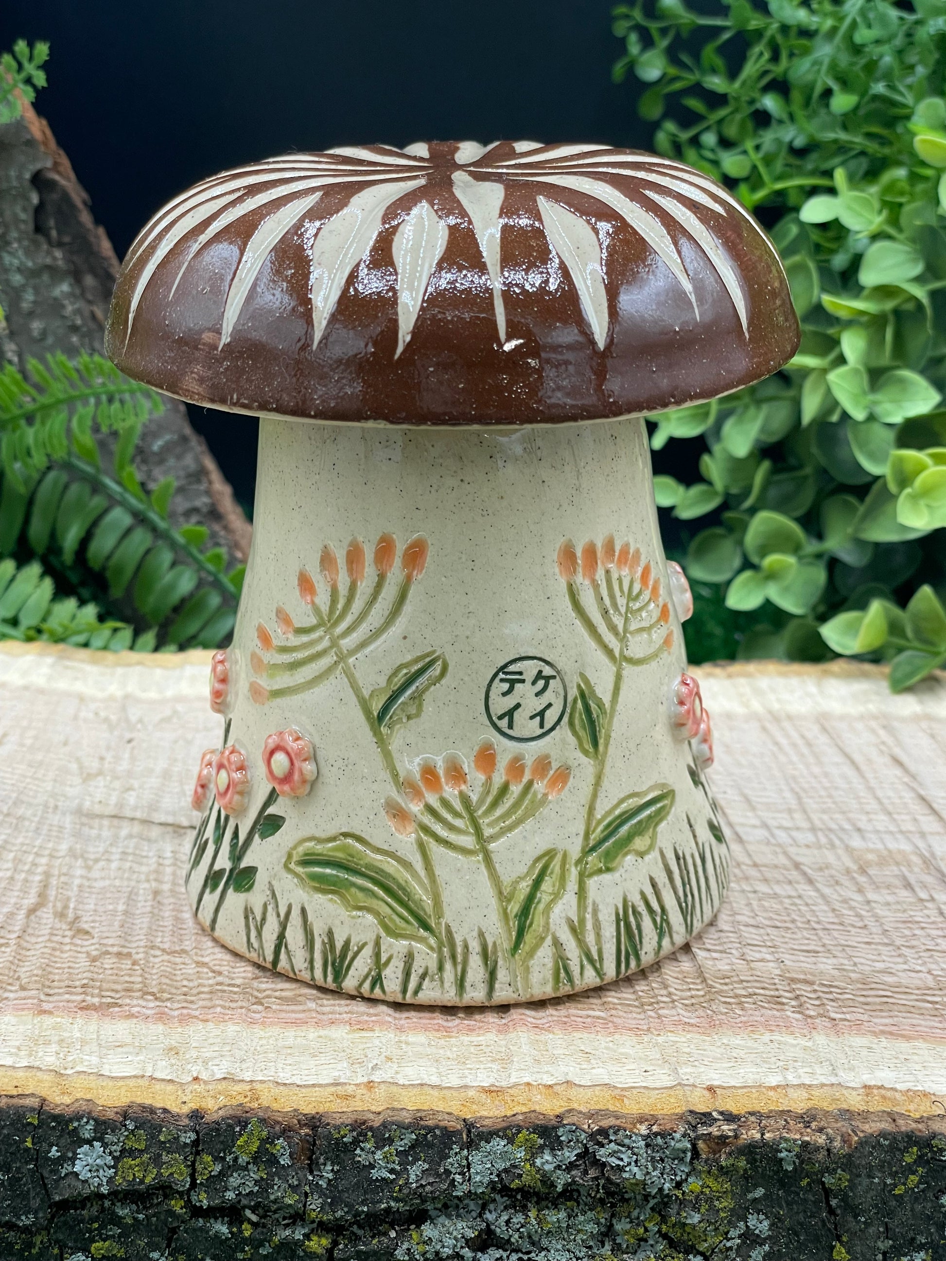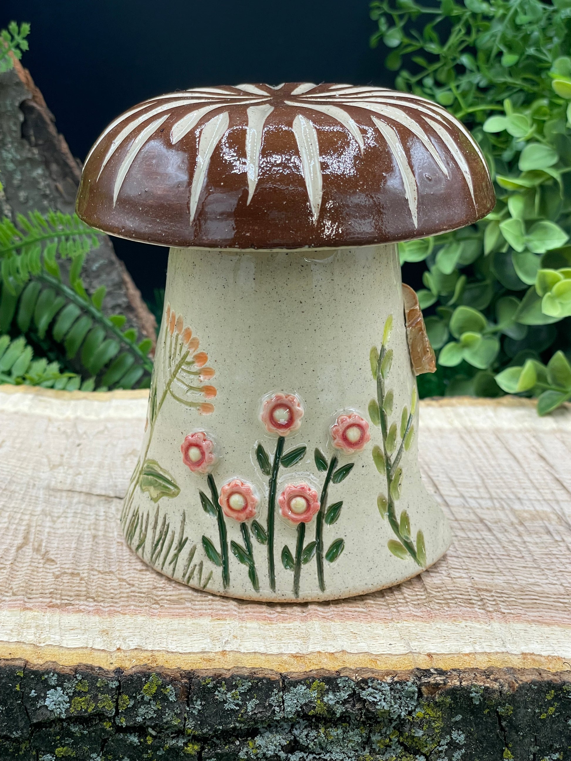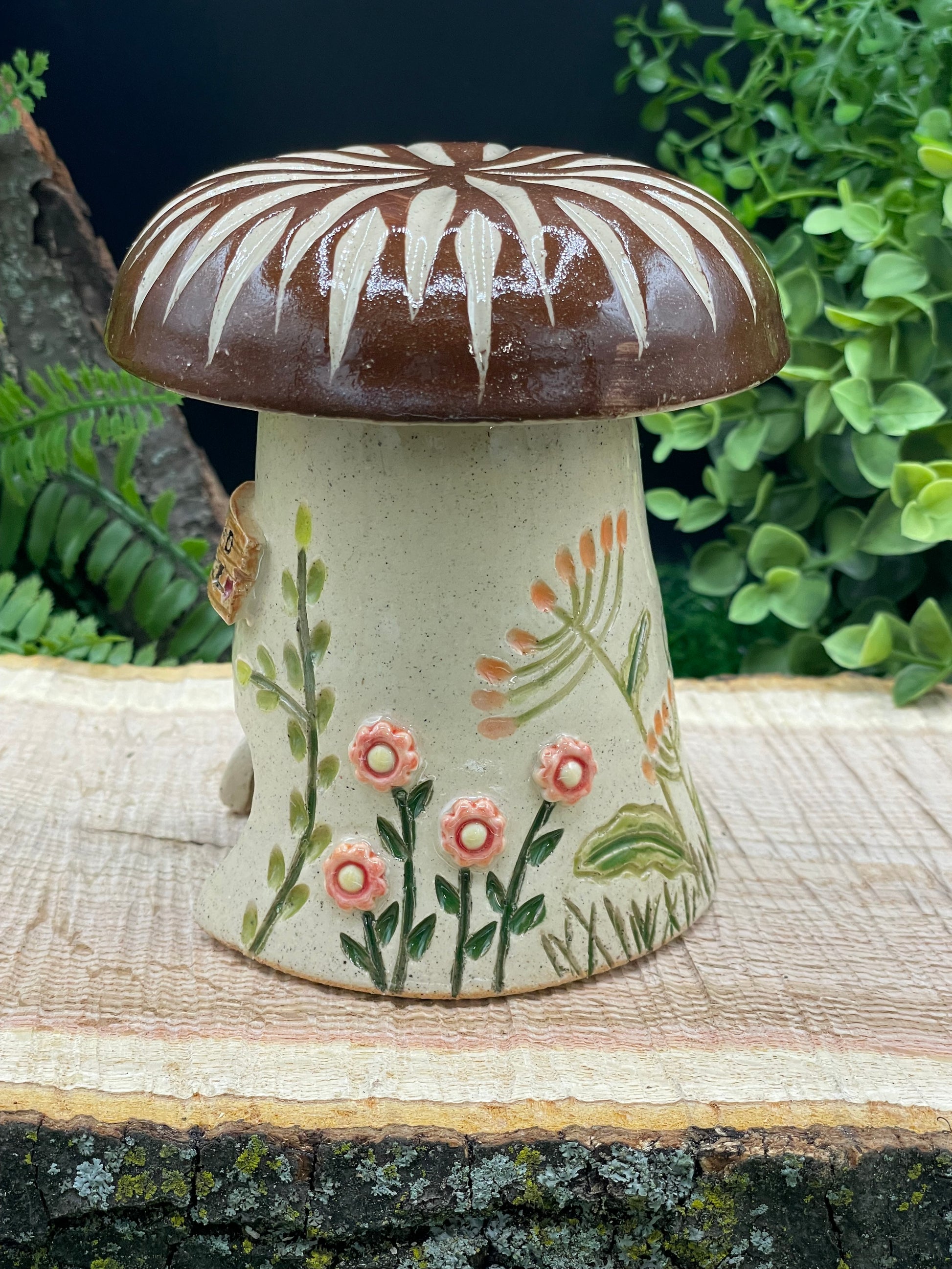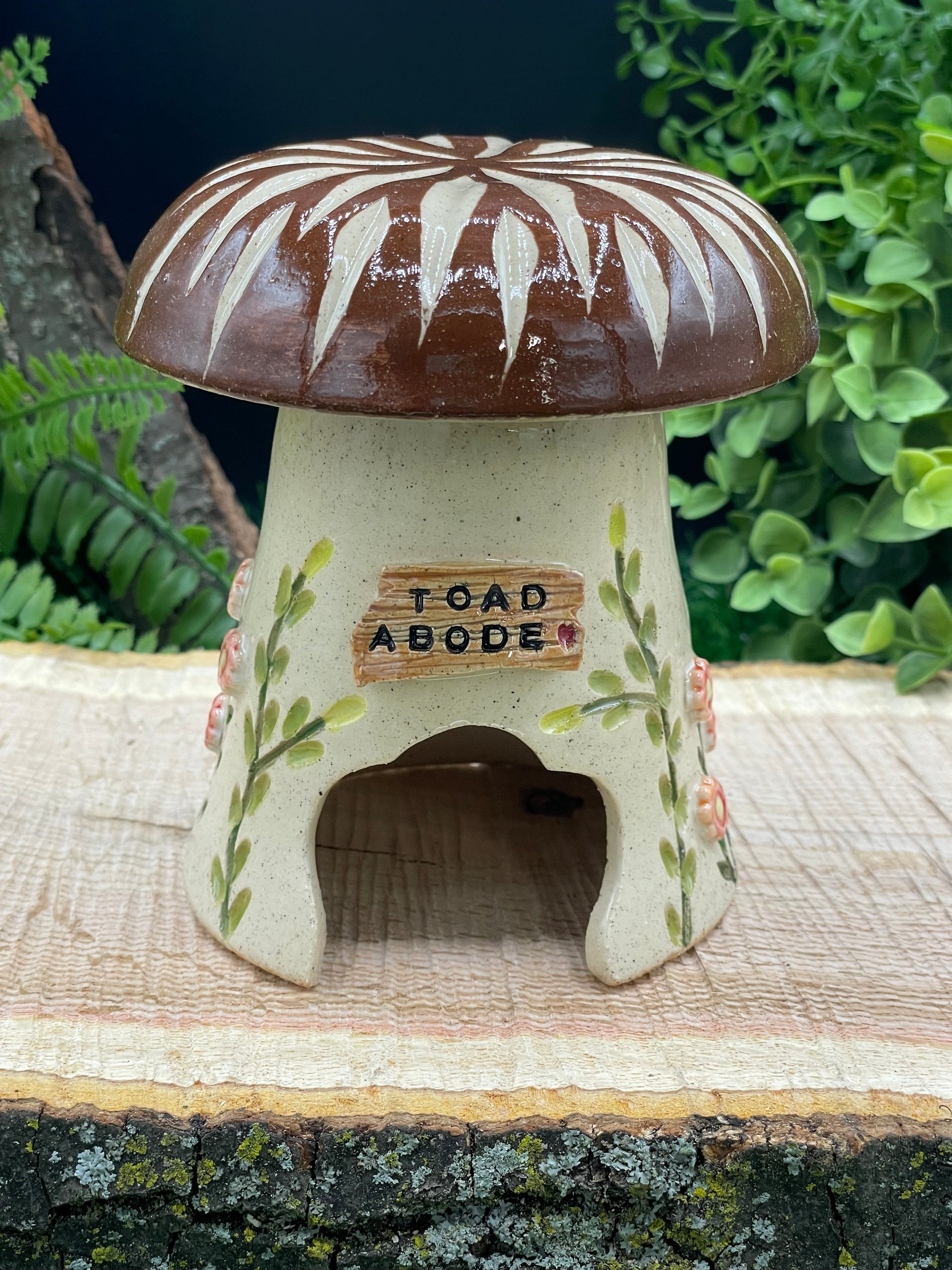 Hop on over to this adorable toad house, featuring hand formed decorative elements and floral accents. Perfect for attracting beneficial amphibians to your garden.