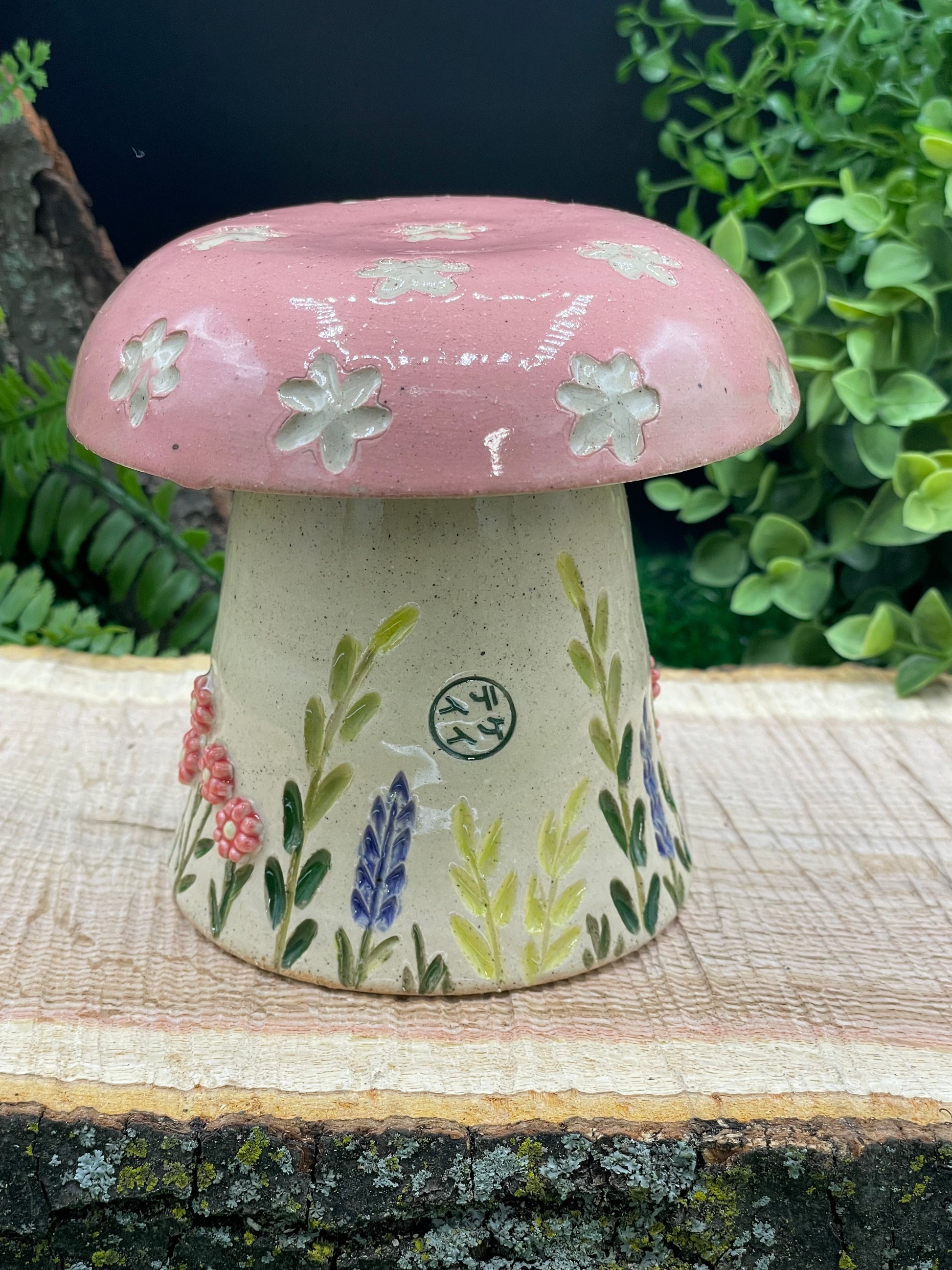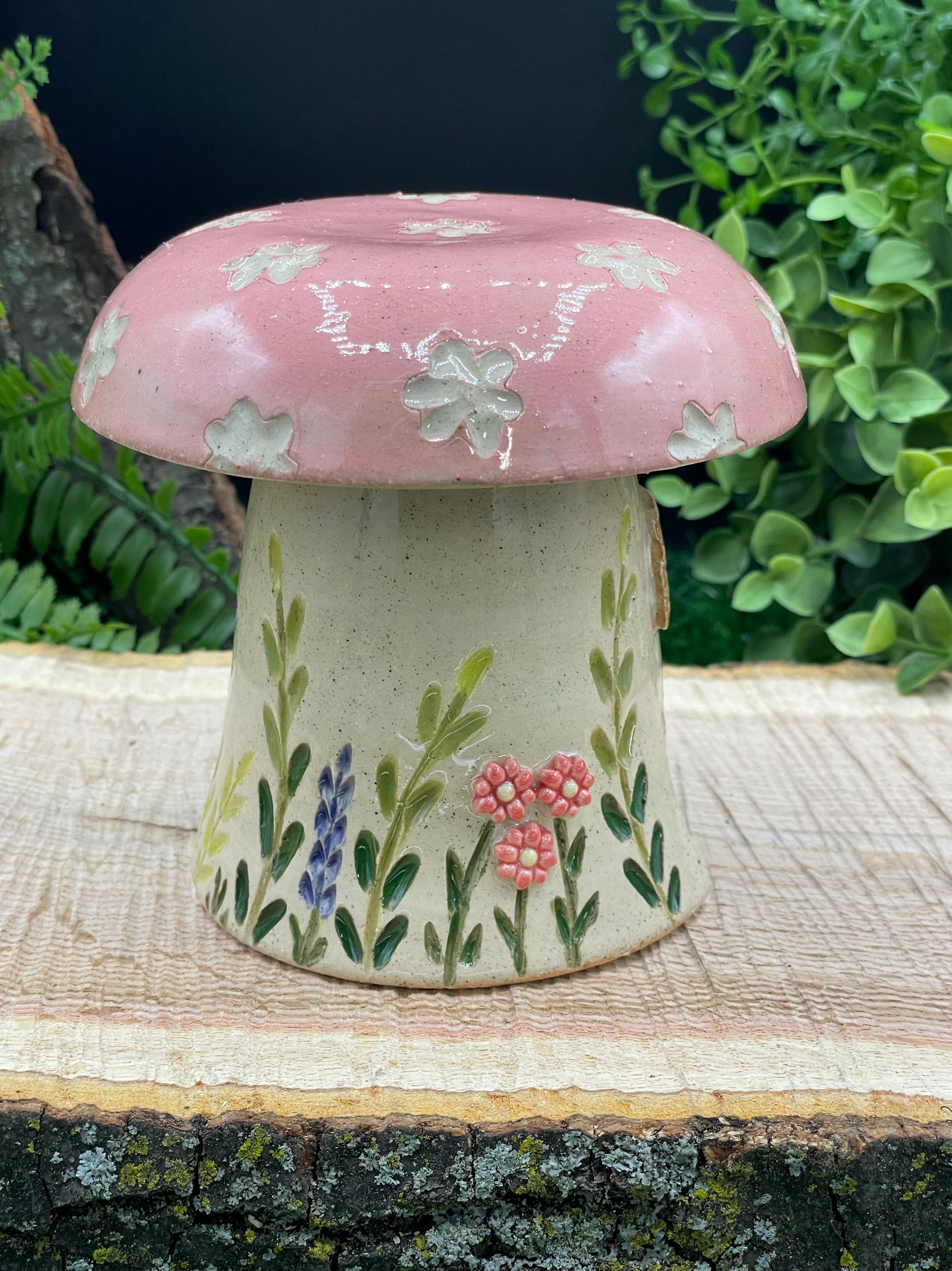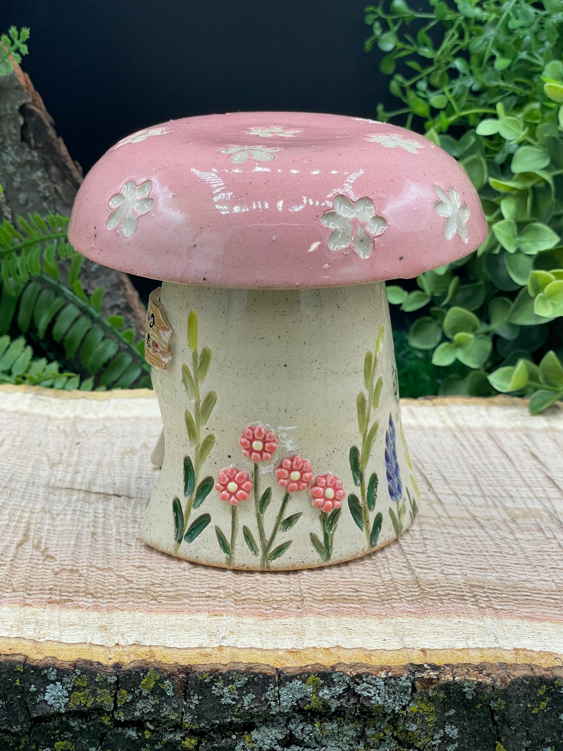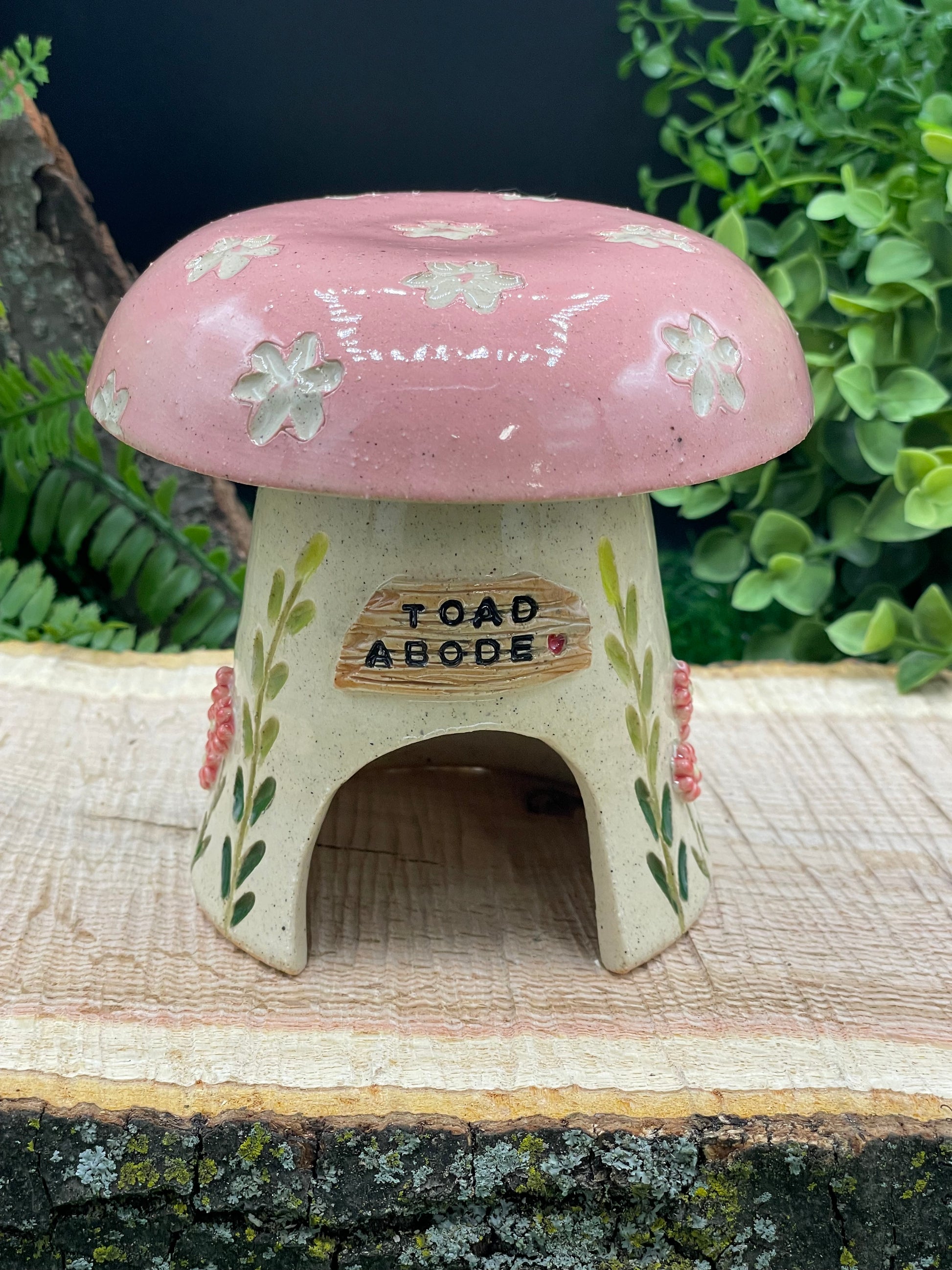 Hop on over to this adorable toad house, featuring hand formed decorative elements and floral accents. Perfect for attracting beneficial amphibians to your garden.