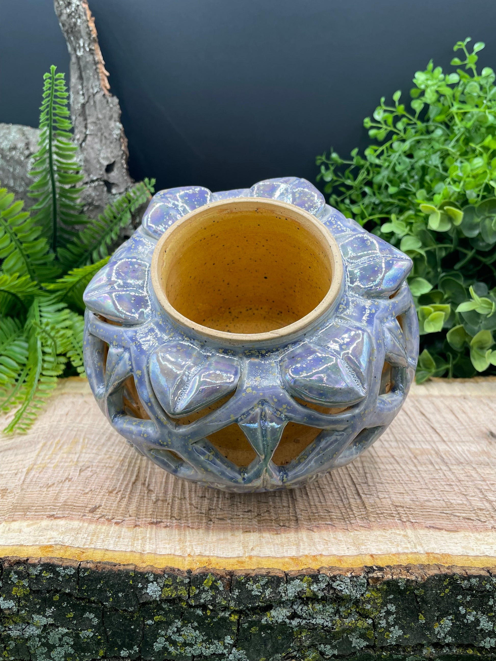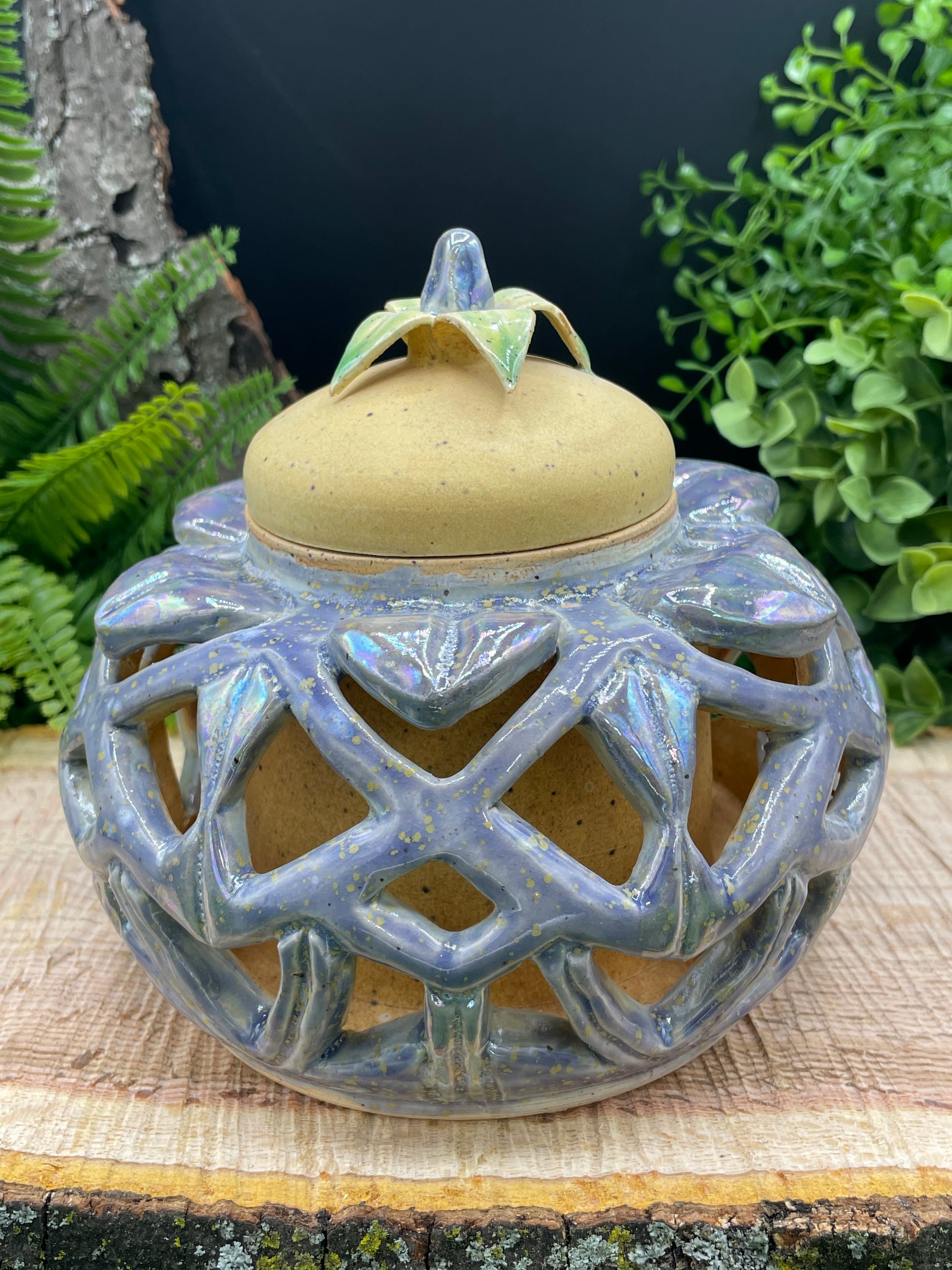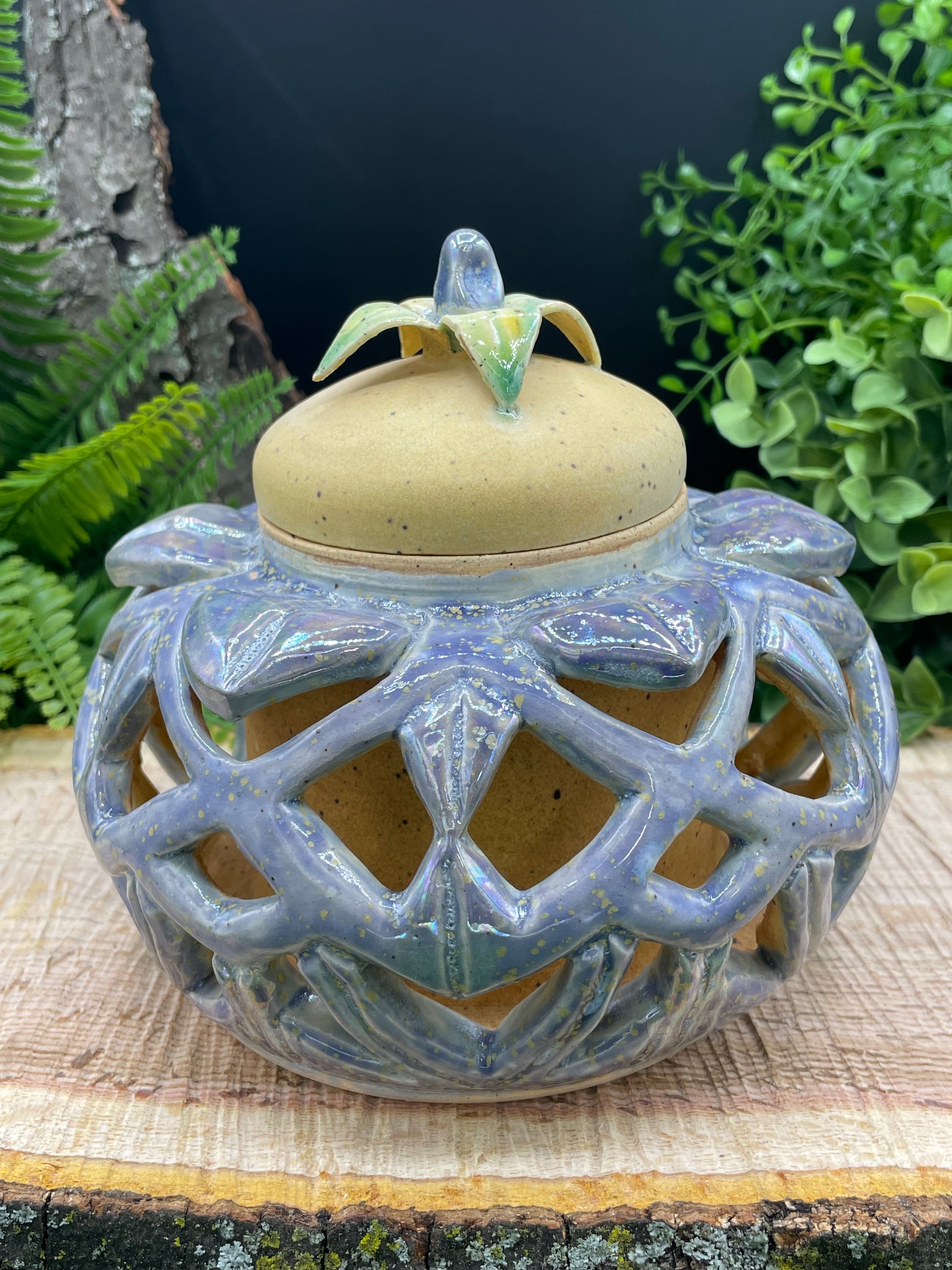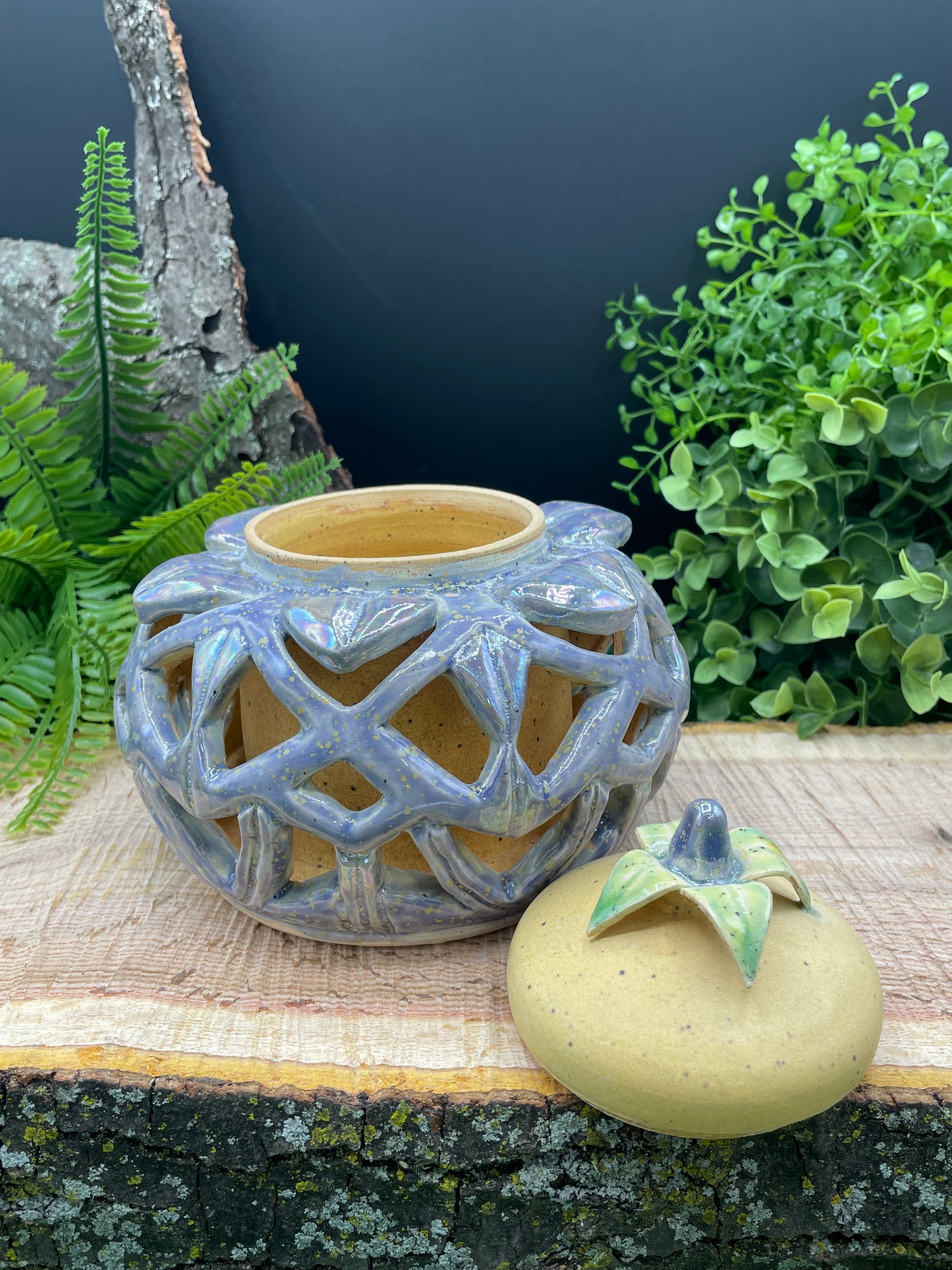 Indulge in a touch of luxury with our DW-6-Lilac. This unique double walled container is not just functional, it's also a work of art. Hand-glazed in a delicate lilac and sunny yellow, with a stunning floral accent on top. Elevate your space with this elegant and exclusive piece.